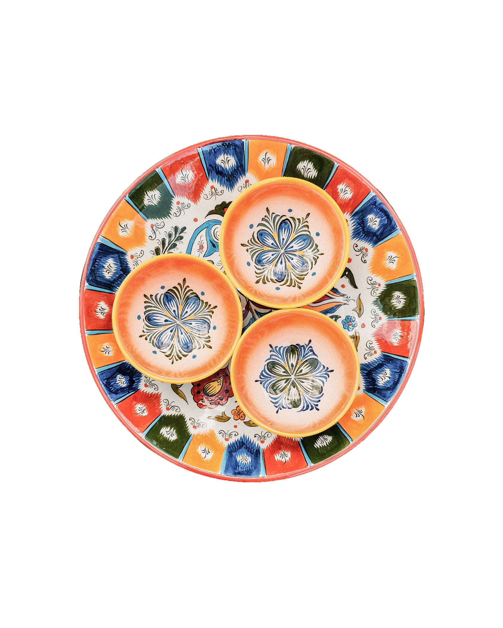 Большое количество наименований тарелок, шампуров, ножей. А также Узбекские ляганы ручной работы.