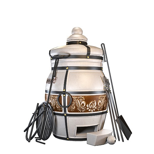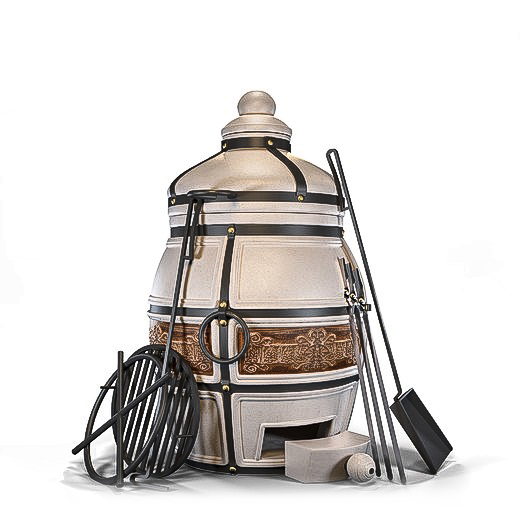Комплектация: тандыр в сборе – 1 шт.; шампуры – 8 шт.; кочерга; совок; колосник; приспособление для подвешивания шампуров; подставка для крышки;